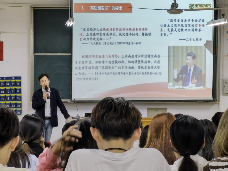 课堂上,马书记用精美的课件、详实的史料、平实的语言和生动的案例紧紧围绕“高质量发展的内涵要求”、“高质量发展的战略部署 ”和“为高质量发展积蓄青春力量”三个方面内容阐明了党和政府对今年我国总体经济形势和经济工作的分析研判,指出面对国内外环境,我国经济发展面临复杂严峻的挑战,但我国经济韧性强、回旋余地大,长期向好的基本格局没有改变。同时,马书记分析指出在复杂严峻的经济形势下,必须牢牢坚持党对经济的集中统一领导,必须全面贯彻新发展理念,加快构建新发展格局,坚定必胜信心,推动中国经济在高质量发展的道路上不断书写新篇章,迎来更加光明的美好前景。