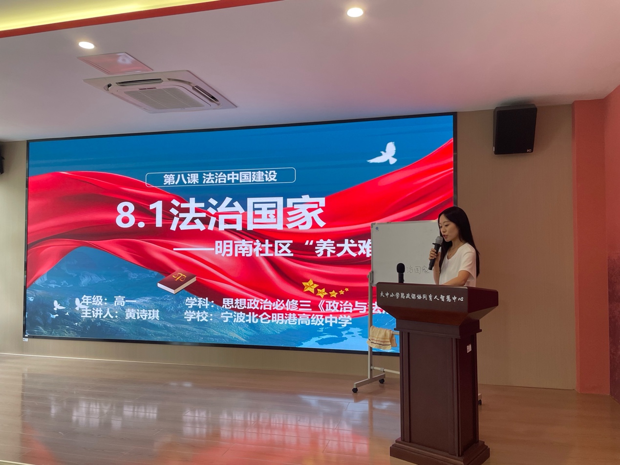 北仑明港高中黄诗琪老师以《法治国家》为题,聚焦明南社区养犬矛盾,通过“模拟听证会”引导学生不同利益方的法律诉求,进而分析法治国家的建设应当围绕“推进宪法实施、建立完备的法律体系、完善法律实施机制”等展开,让学生在思辨中形成法治思维。