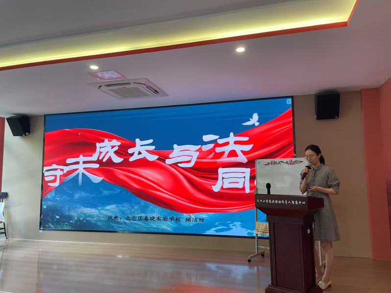 北仑区春晓实验学校顾洁琼老师以《守未成长 与法同行》为题,通过“想想的一天”生活场景,引导学生发现法律无处不在,并重点解读《未成年人保护法》如何护航青少年成长,利用情景模拟等互动方式帮助小学生强化规则意识。