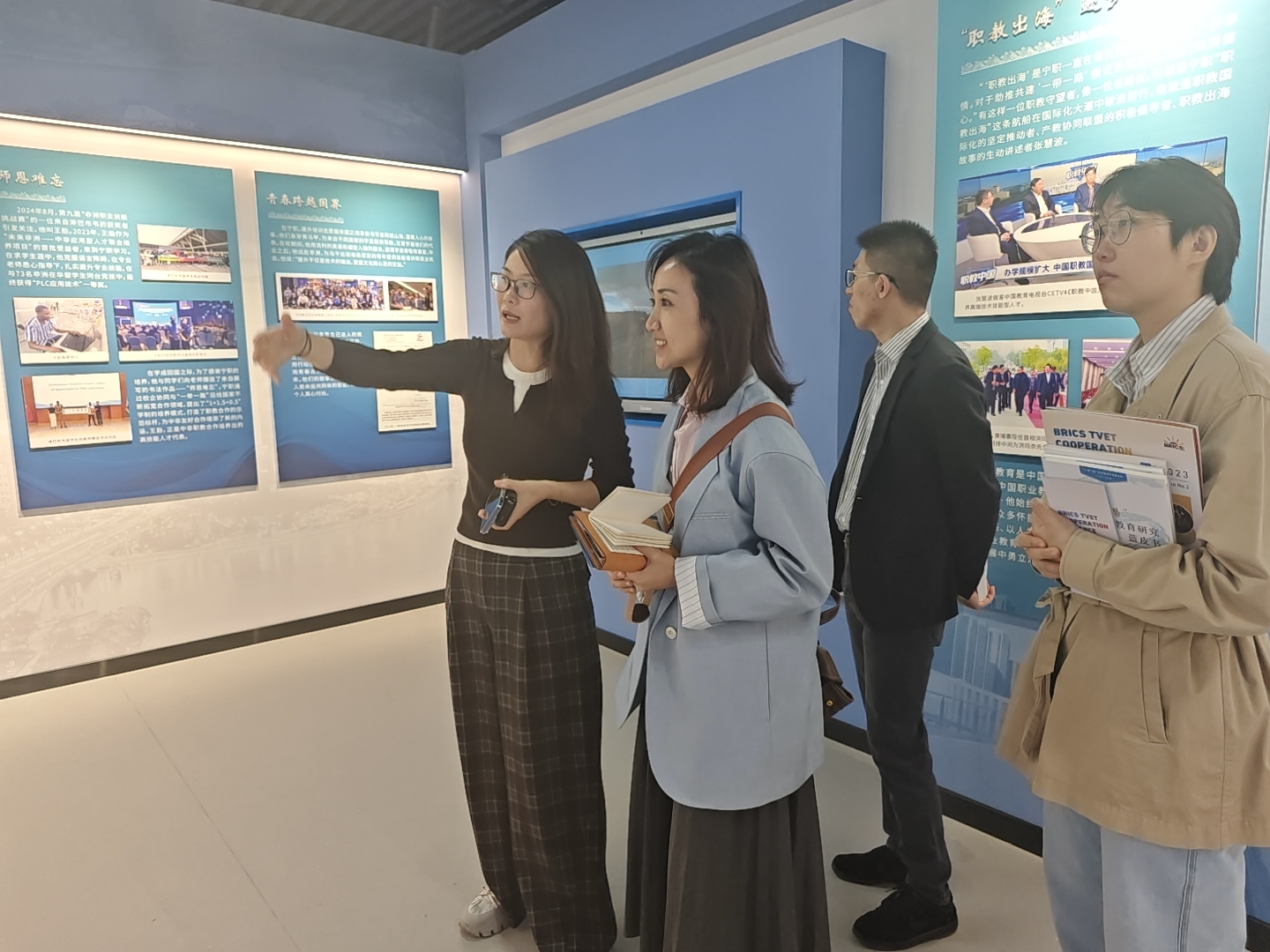 2025年10月27日,厦门大学教育研究院余婧然老师一行莅临“海通波宁大道同行”思政育人场馆参观交流,校职业教育研究与发展规划中心副主任张振陪同参观。