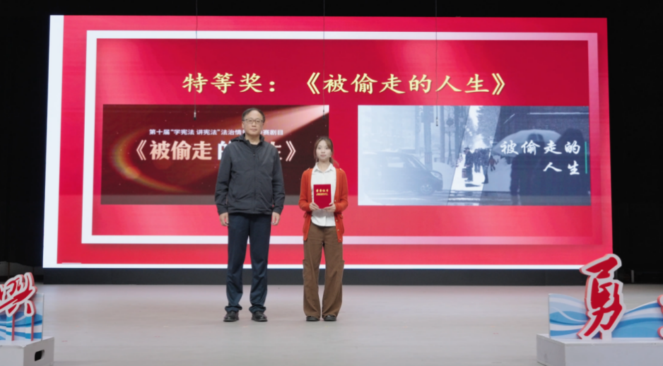 活动现场展演了法治情景剧《被偷走的人生》。今年暑假该剧已代表我校征战浙江省第十届大学生“学宪法 讲宪法”比赛。该剧凭借深刻的法治主题、生动的情节设计与真挚的演绎,从众多高校作品中脱颖而出,最终斩获高校组法治情景剧省级特等奖。此次在特色思政课相关活动中再度展演,剧目聚焦提升宪法精神,以舞台艺术为载体打造沉浸式法治教育课堂,让在场师生直观感受法治精神的力量,为特色思政课注入了鲜活的法治教育元素。