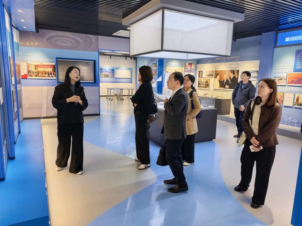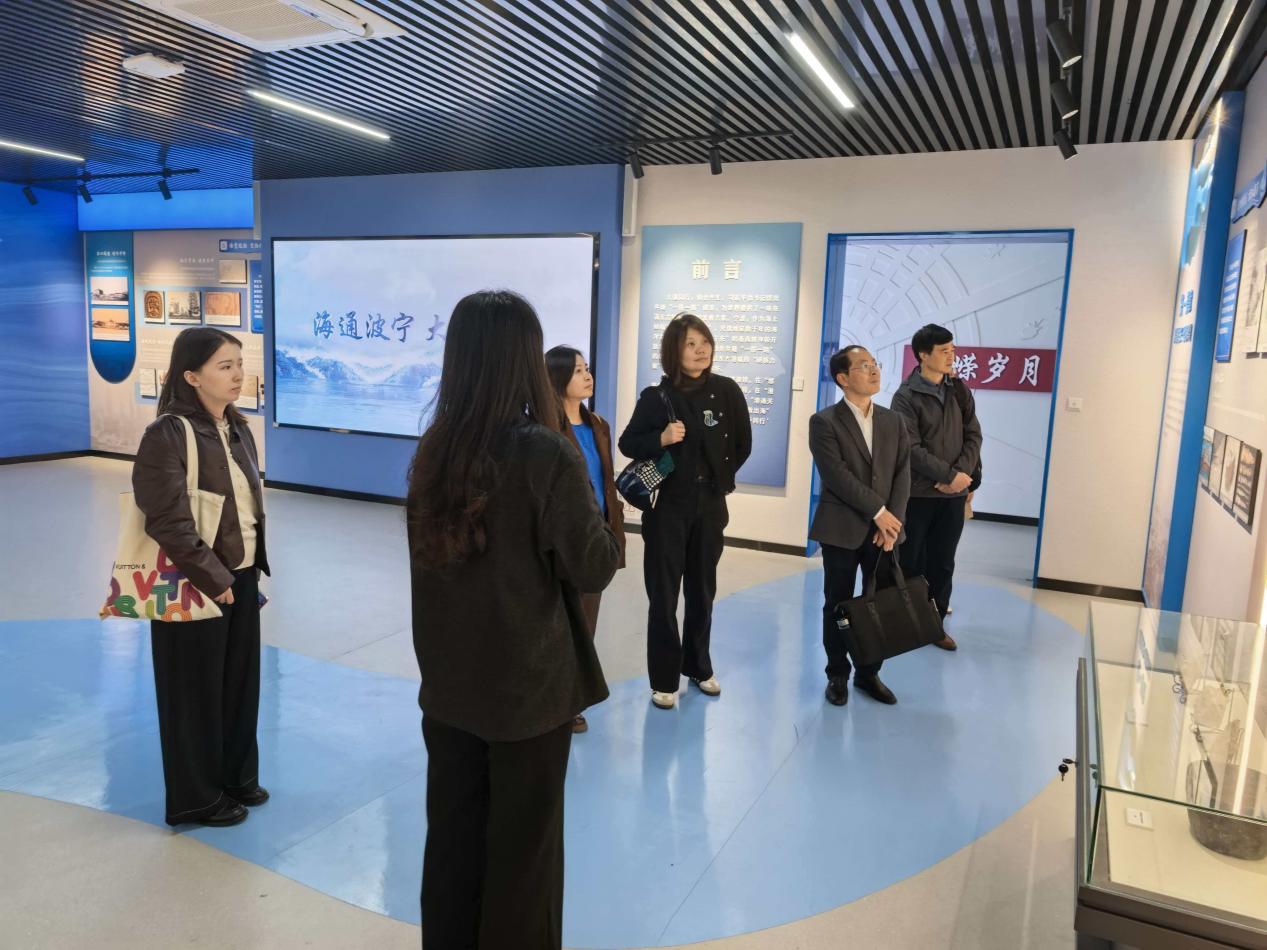 在马克思主义学院教师雷丹丹的引导下,李冬生部长一行实地参观了展馆的各个区域。讲解员围绕展馆的建设理念、主题篇章以及与场馆育人实践等方面进行了详细介绍。展陈内容围绕“海韵悠长 丝路辉煌”“甬商接力 港城崛起”“港通天下 勇立潮头”“职教出海 宁职先行”“命运与共 携手同行”五个主题篇章,展现了宁波与宁职大深入参与“一带一路”倡议,构建人类命运共同体的历史与实践。