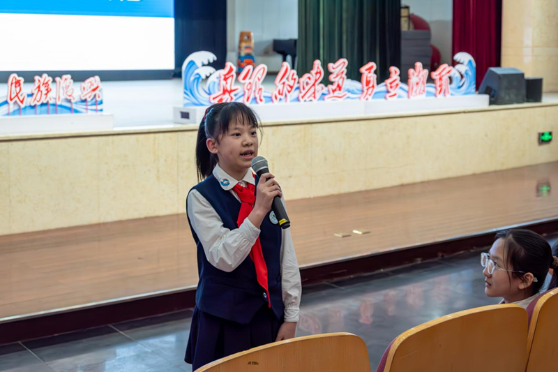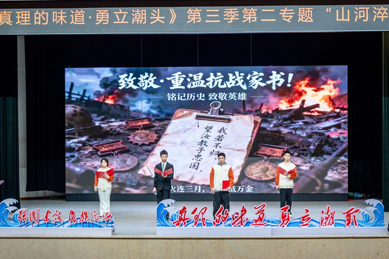 课程运用“声、像、情、理”多元融合的教学方式,将厚重的革命历史转化为沉浸式的青春对话。在“致敬·重温抗战家书”环节,宁波东海实验学校学生张怀书深情朗诵革命先烈刘伯坚的家书,清朗而坚定的声音穿越时空,将家国情怀传递到每位听众心中。
