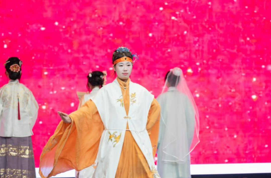 随后,汉服展示《红楼遗梦》惊艳上演。同学们身着织锦元素的定制汉服,水袖轻扬,衣袂翩飞,随着古乐翩翩起舞。飘逸的身影化作流动的画卷,为大家带来一场直击心灵的视觉盛宴,将现场气氛推向高潮。