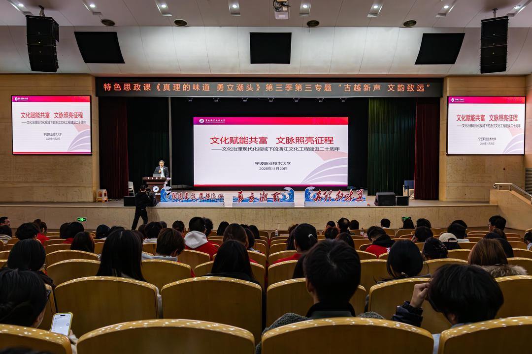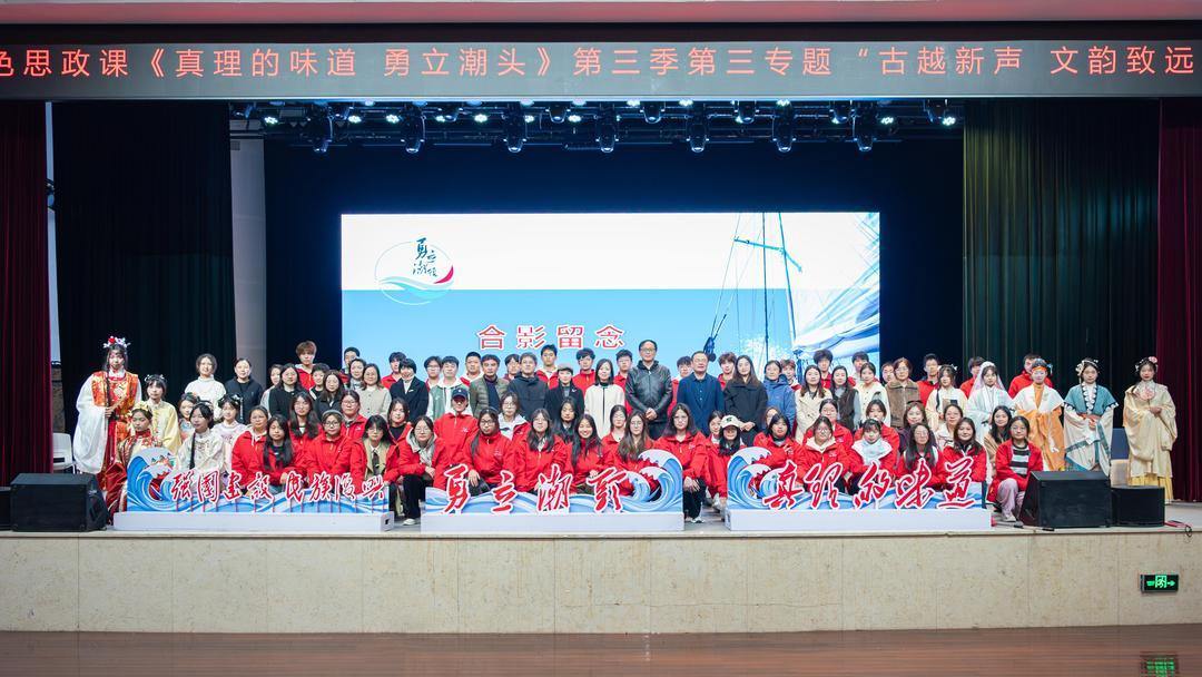 这是该校特色思政课《真理的味道•勇立潮头》第三季第三专题“古越新声 文韵致远”的课堂实景,本专题由马克思主义学院和建筑与艺术学院融合打造。宁职大校长吴向鹏亲自领衔授课,用“互动闯关+非遗展示+汉服舞蹈”的沉浸式玩法,让思政课秒变“文化盛宴”,现场师生直呼“听得入迷、玩得过瘾”。