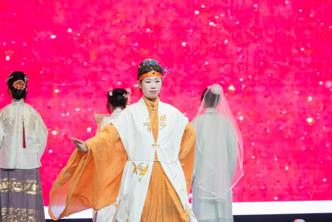 课堂尾声,《红楼遗梦》汉服秀惊艳亮相。学生们身着绣有织锦纹样的定制汉服,随着古乐翩翩起舞,“黛玉葬花”“宝钗扑蝶”的经典场景被演绎得惟妙惟肖。在水袖轻扬间,动静相宜中,不仅展现了传统服饰的华美,更将古典文学的气韵与情感娓娓道来,令人沉醉不已。
