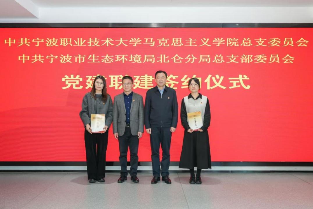 为充分发挥党建引领作用,深化校局合作,2025年12月11日,中共宁波职业技术大学马克思主义学院总支部委员会与中共宁波市生态环境局北仑分局总支部委员会党建共建签约仪式暨主题党日活动在宁波(北仑)生态文明教育馆顺利举行。宁波职业技术大学党委副书记余怡春、宁波市生态环境局北仑分局局长王涛出席活动并见证签约。马克思主义学院副院长吕勇,宁波市生态环境局北仑分局副局长张红枫及双方相关部门负责人参加活动。