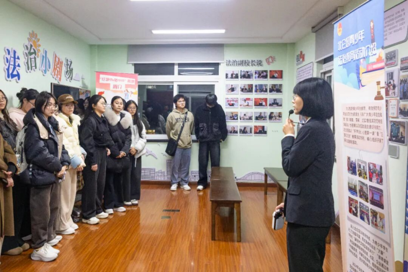 在诉讼服务大厅,同学们近距离观察立案窗口、自助服务终端等便民设施,详细询问案件受理、调解流程等问题,知晓了群众如何通过法律途径高效维护自身权益;在“浙里春风・童护航”未成年人审判工作室,温馨的色彩搭配、专业化的心理疏导区域与充满人文关怀的审判环境,让大家深刻感受到司法对未成年人的特殊保护与温情守护,理解了“法治不仅有力度,更有温度”的深刻内涵;在院史文化馆,一张张承载记忆的老照片、一件件见证发展的实物展品、一段段记录坚守的文字介绍,系统展现了北仑法院践行法治精神、守护公平正义的初心与历程,让同学们对我国法治建设的发展脉络有了更清晰的认知,对司法工作者的责任与担当心生敬意。“以前总觉得法院庄严而遥远,今天才发现司法服务如此贴近生活,既有权威也有温情。”贺贤土学院物流管理4251班一名参与学生表示。多场景的沉浸式参观,帮助学生建构起对法院职能、司法文化和社会治理的立体认知。马克思主义学院王云艳老师看着同学们专注提问的身影,感慨道:“法治教育最动人的模样,就是让学生从‘被动听’变为‘主动探’,这样的实地研学比课堂说教更有力量。