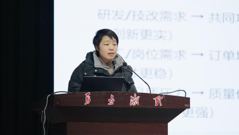 紧接着,化学工程学院教师施美霞带来的微课《区域服务经济:宁职大与恒河材料产教融合实践》,从国家“十五五”规划的宏观视角出发,细致分析了职业教育在推动绿色低碳转型、实现高质量发展中的独特价值。施老师指出,职业教育应主动调整专业设置,优化课程体系,主动服务区域服务经济,为高质量发展注入绿色动能。