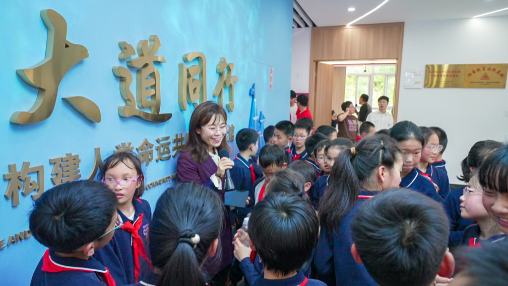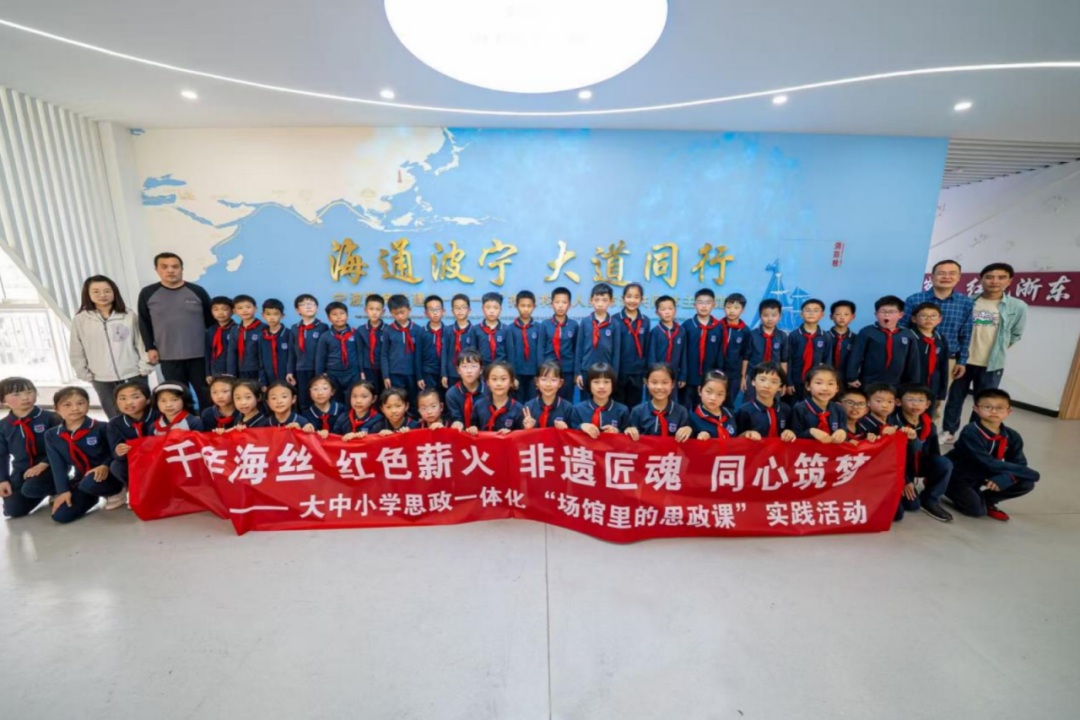 4月9日,宁波职业技术大学树人中心依托“海通波宁 大道同行”主题馆与“红色浙东 峥嵘岁月”主题馆,创新开展思政一体化育人实践,一堂别开生面的场馆思政课正式开讲。马克思主义学院 “人亚・青年先锋班” 青年学子与宁波东海实验学校300余名小学生齐聚一堂,共上一堂沉浸式、互动式、体验式的思政实践课。课程以 “千年海丝·红色薪火·非遗匠魂·同心筑梦”为脉络,充分发挥红色场馆与文化阵地的育人功能,推动大中小学思政教育同向同行、有机衔接,让青少年在实景浸润与实践体悟中传承红色基因、厚植家国情怀,生动彰显了场馆育人与思政一体化建设的鲜活成效。