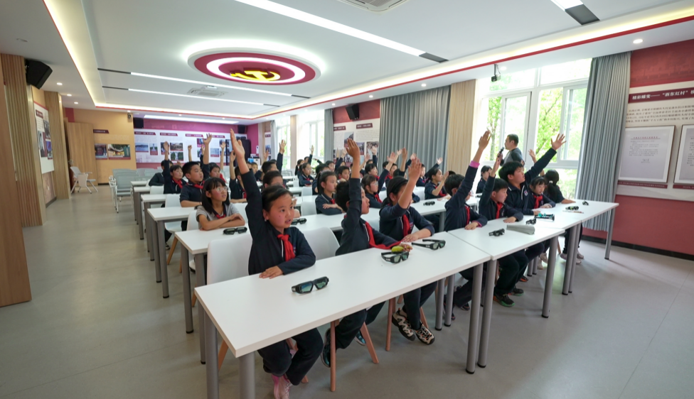 3D虚拟红色知识场景体验结束后,红色知识大闯关活动火热启幕,同学们精神饱满、踊跃抢答,在趣味比拼中深化对红色文化的理解。闯关间隙,激昂的红歌声响彻展厅,同学们齐声高唱经典红歌,旋律铿锵、情感真挚,唱出了新时代少年对革命先辈的崇敬与对祖国的热爱。
