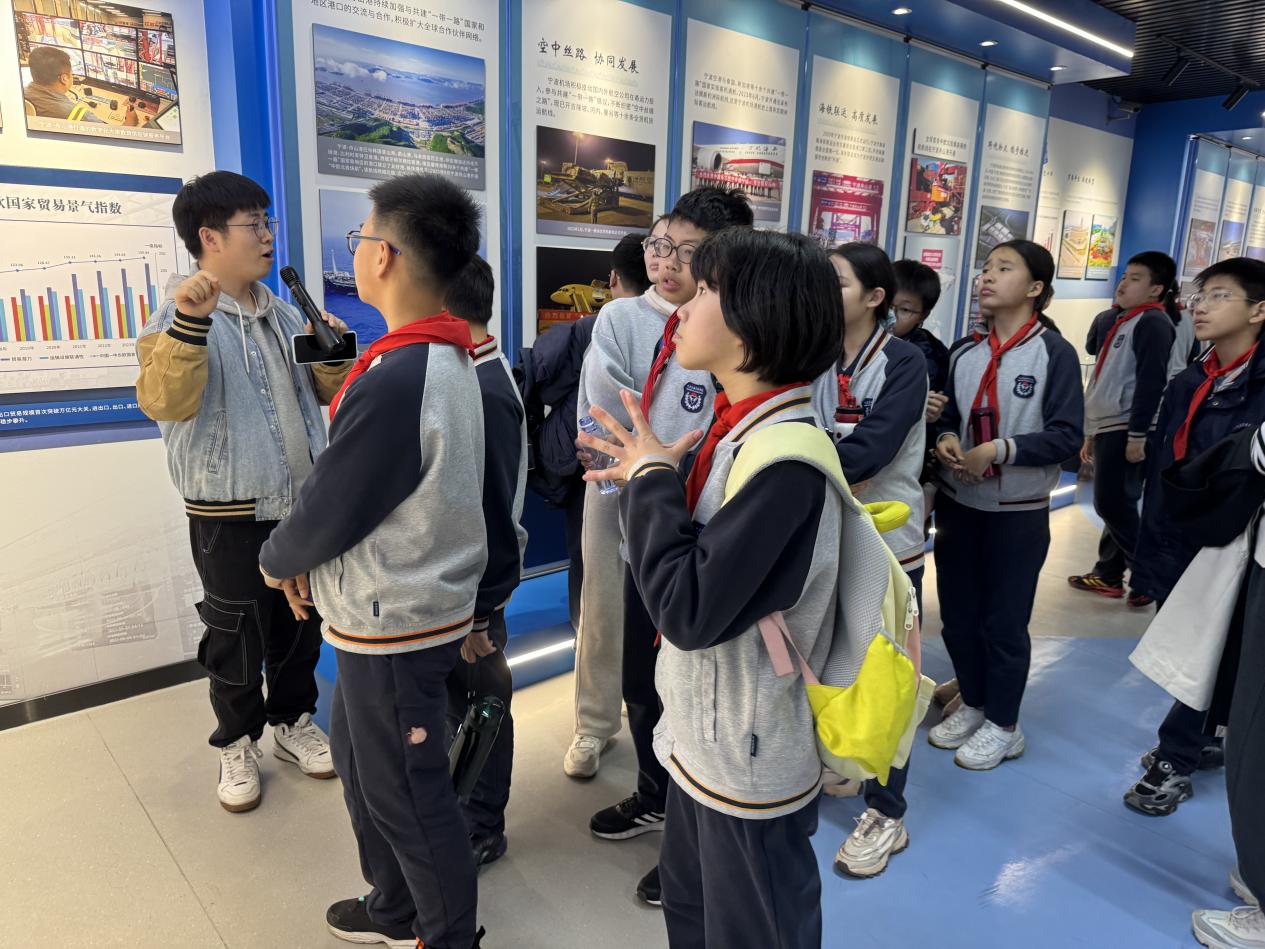 走到“甬商接力 港城崛起”展区,宁波帮勇闯天下、反哺家乡的故事让同学们深受触动。在王银君老师的带领下,大家认真聆听包玉刚、董浩云等甬商精英的事迹,纷纷感叹宁波商帮的智慧与担当。在“职教出海 宁职先行”篇章,当得知宁职大的职教成果走出国门、惠及130多个国家时,孩子们更是发出阵阵赞叹,还饶有兴致地向雷丹丹老师分享自己熟知的中国智慧与中国方案。